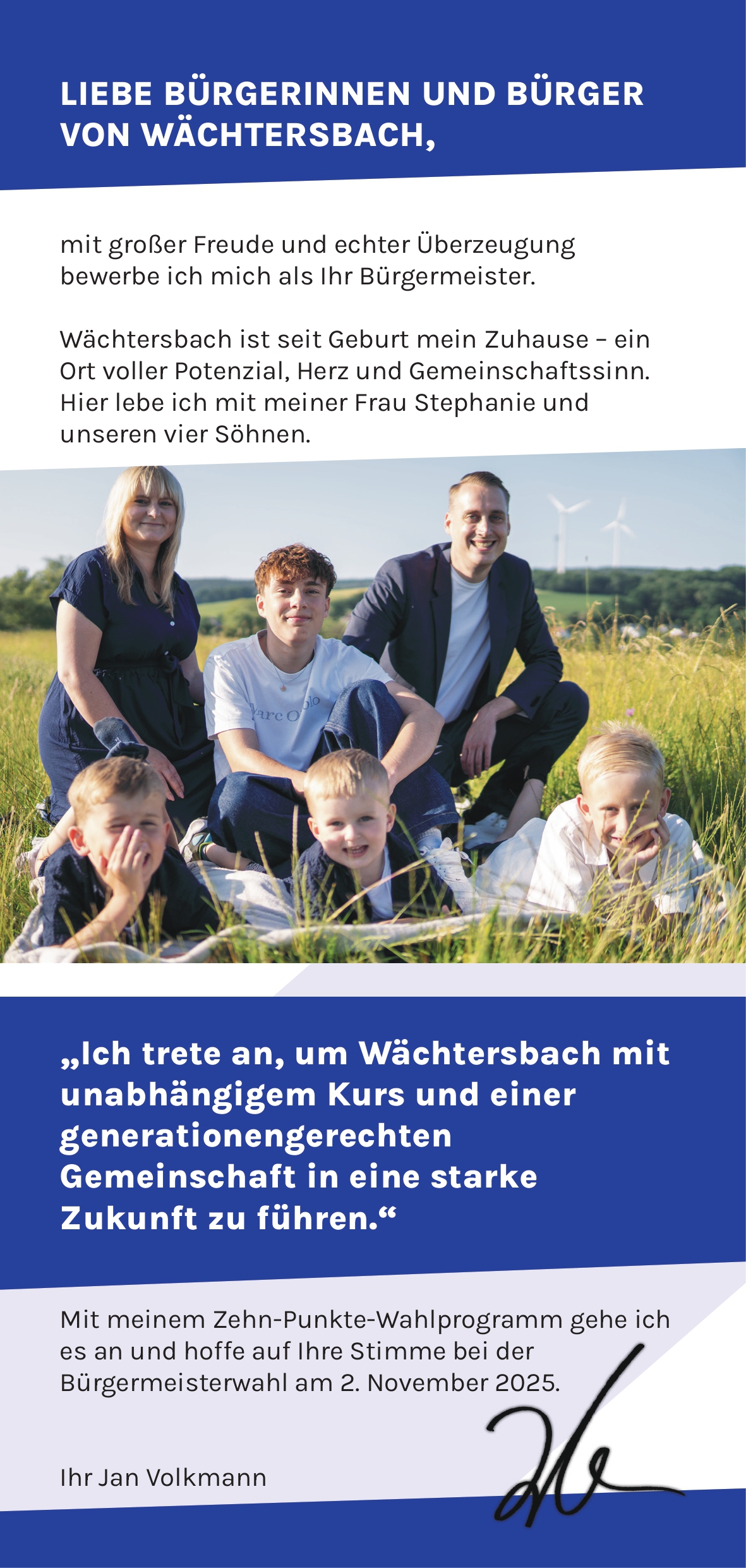 mit großer Freude und echter Überzeugung bewerbe ich mich als Ihr Bürgermeister. Wächtersbach ist mein Zuhause – ein Ort voller Potenzial, Herz und Gemeinschaftssinn. Ich trete an, um gemeinsam mit Ihnen unsere Stadt zukunftssicher, lebenswert und stark zu gestalten.